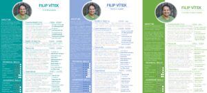 * Then create clone of your master CV to highlight skills and role relevant past experience, achieving at (slightly) unique CV for each of the roles. (My advice make them also visually different so that you can easily tell one from the other, you will need to send each to different roles. Having visual clue helps not to mess it up. For illustration, my final role-specific CV’s looked following: